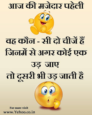 मजेदार हिन्दी पहेलियाँ (जवाब नीचे देखें ) एक मंजिला है घर मेरा रखा उसमें नीला सोफ़ा नीला कालीन , नीला पंखा हर तरफ है रंग नीला बताओ सीढ़ियों का रंग है क्या ? आज की यह मजेदार हिन्दी पहेली आपकी दिमागी क्षमता को देखने के लिए विशेष है इसलिए थोड़ा ध्यान से पढ़ें और फिर जवाब दें । अगर आपने इस हिन्दी पहेली का सही जावब दे दिया तो आप काफी बुद्धिमान हैं और समझदार भी हैं । जवाब वहाँ कोई सीढ़ियाँ ही नहीं हैं ! जरा सोचिए पहले ही बताया गया है की घर एक मंजिल का है तो वहाँ सीढ़ियाँ ही नहीं होंगी ना । Subscribe us for latest new Hindi Jokes , Hindi Chutkule , Hindi decent Jokes , Hindi Paheliya , Hindi Sayari , Hindi Stories , Hindi Short Stories , Religion Knowledge , Riddles , Quiz , Hindi knowledge about health , Hindi News, Knowledge about love & Romance , Hindi motivational short stories , Hindi kids stories , Hindi Short Stories about relationship love and friendship & More .